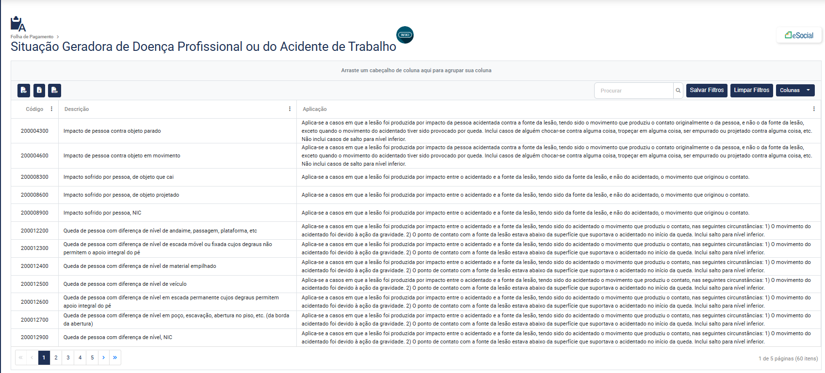 A tabela contendo as Situações Geradoras do Acidente/Doença Ocupacional já está cadastrada e pronta para utilização no Módulo, para visualizá-la acesse o menu Folha de Pagamento>Tabelas>Situações Geradoras do Acidente/Doença Ocupacional