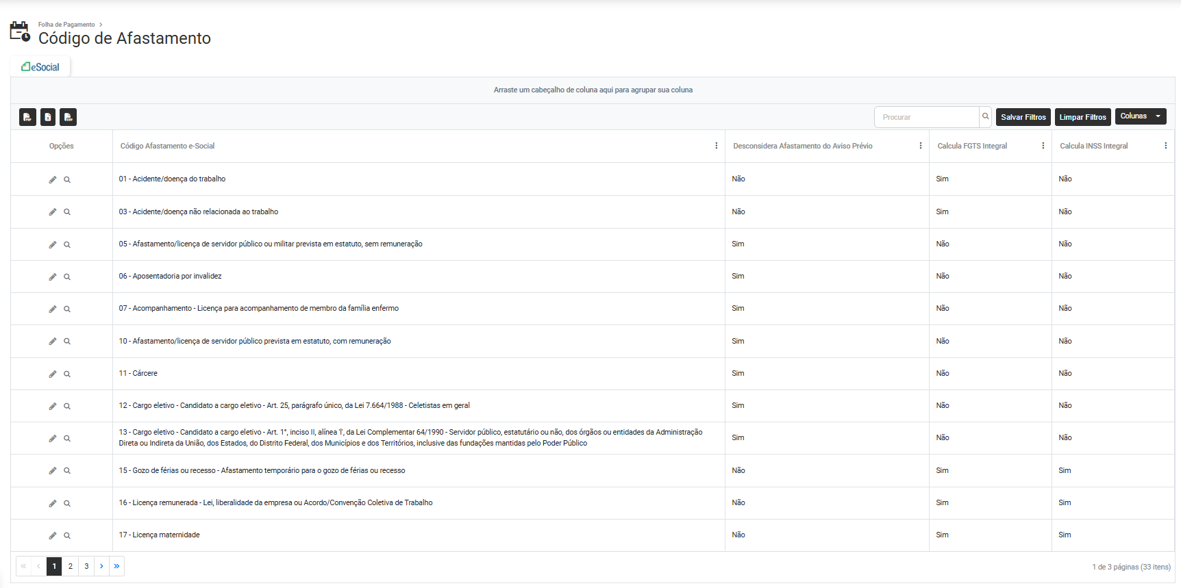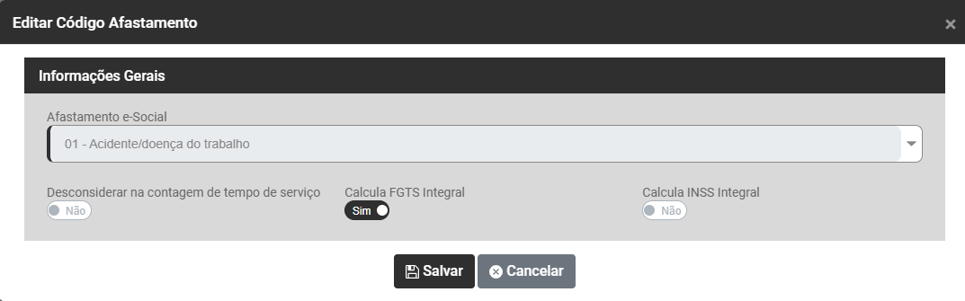 Ao visualizar ou editar o cadastro da tabela de um Código de Afastamento você verá as informações referente: