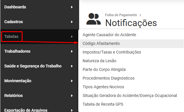 A tabela contendo os Códigos de Afastamento já está cadastrada e pronta para utilização no Módulo, para visualizá-la acesse o menu Tabelas>Código de Afastamento