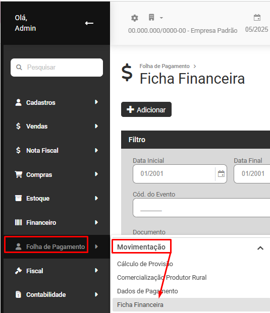 Para acessar a Ficha Financeira dos Trabalhadores acesse o menu Folha de Pagamento>Movimentação>Ficha Financeira