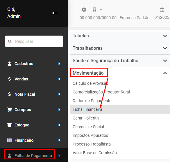 Para acessar a Ficha Financeira dos Trabalhadores acesse o menu Folha de Pagamento>Movimentação>Ficha Financeira