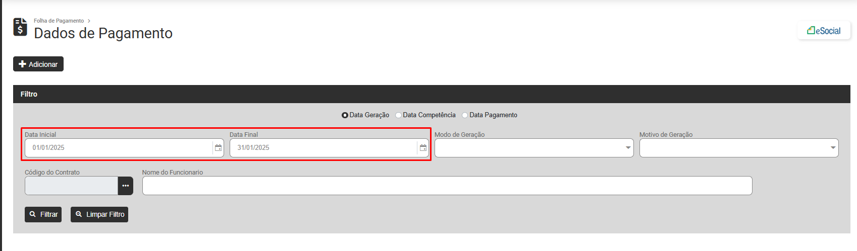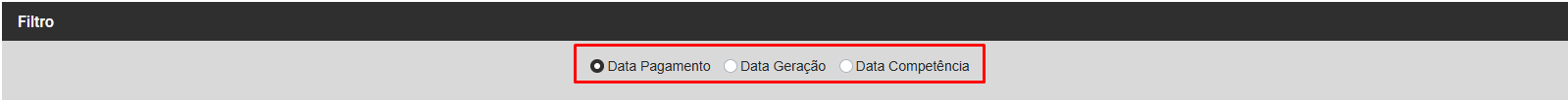 1) Defina se o Filtro realizado será por Data de Geração, Data de Competência ou Data de Pagamento