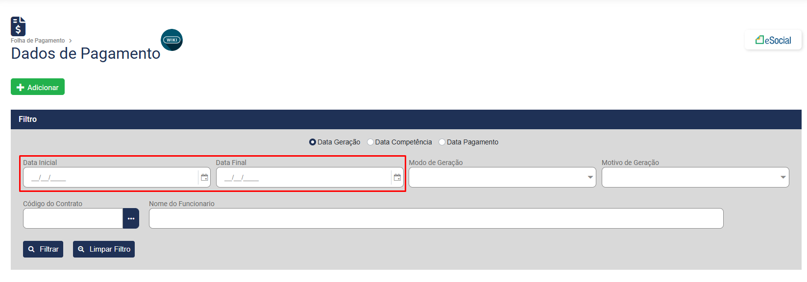 1) Defina se o Filtro realizado será por Data de Geração, Data de Competência ou Data de Pagamento