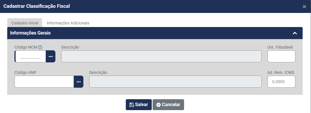Será apresentada a tela para Cadastrar Classificação Fiscal (NCM)