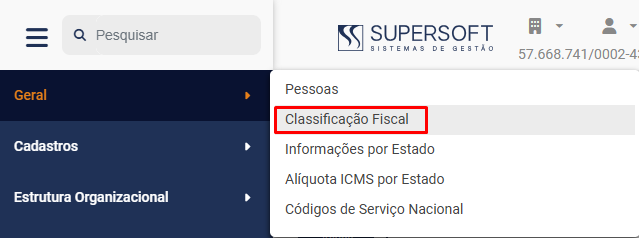 Para cadastrar as Classificações Fiscais de sua Empresa, acesse o menu Geral>Classificação Fiscal