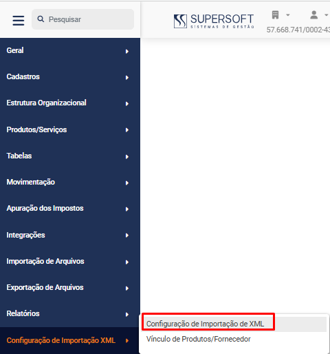 Para realizar a configuração de Importação de XML acesse o menu Configuração de Importação XML>Configuração de Importação de XML