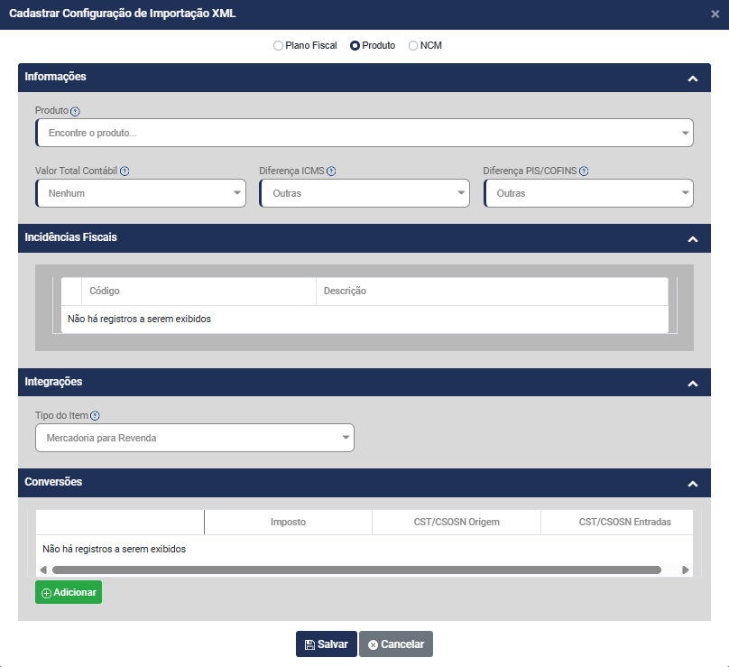 Faça a configuração dos Produtos que serão utilizados na importação do XML