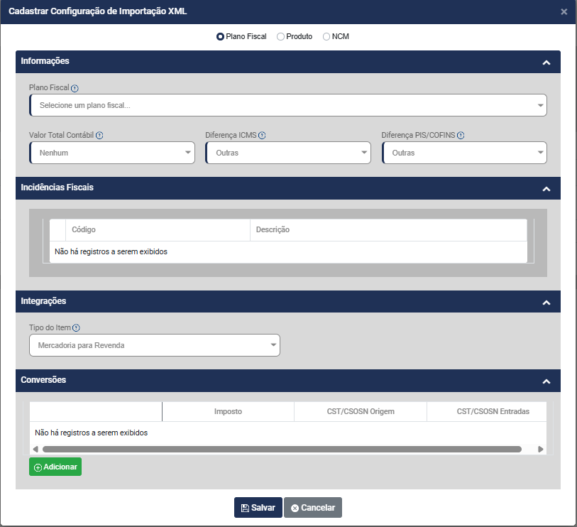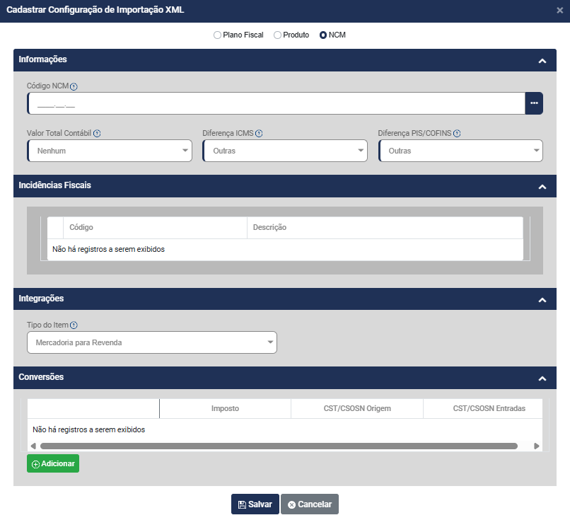 Faça a configuração dos NCM que serão utilizados na importação do XML
