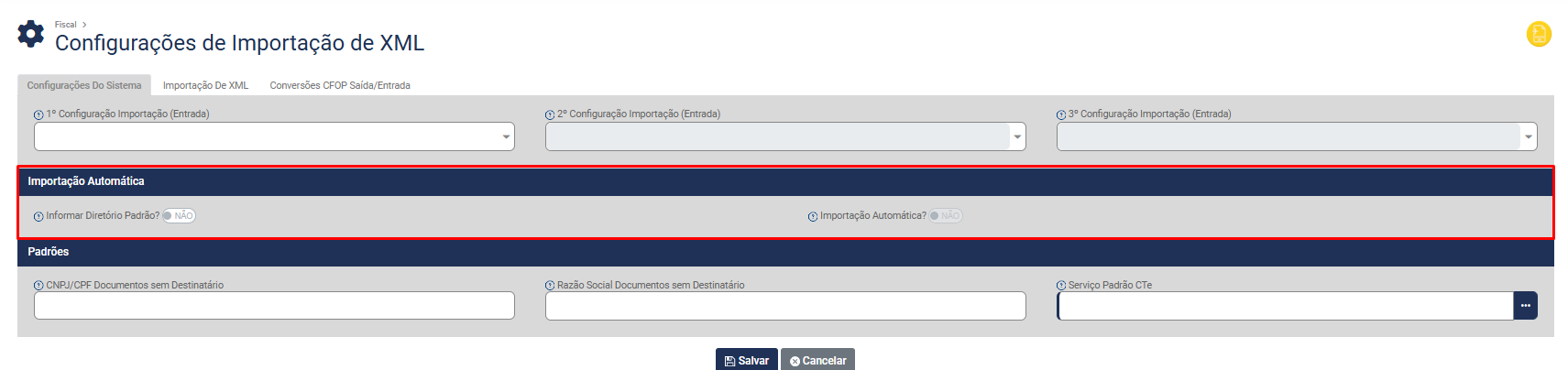 - Defina se a Importação será automática sim/não - A importação dos XML será feita automaticamente conforme o período pré definido usando os arquivos da pasta de Origem e movendo para a pasta de Destino os já importados