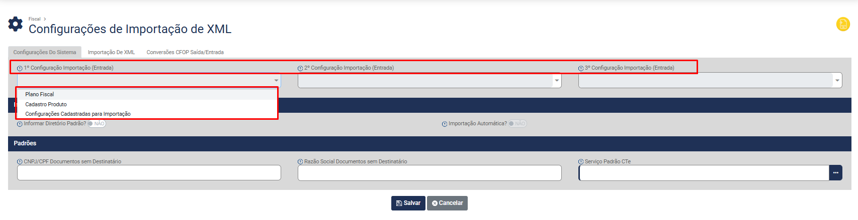 - 1º Configuração de Importação (Entrada) - Selecionar ordem de cadastros a serem considerados na importação de notas fiscais de entrada. Caso não seja preenchido, sistema seguirá dados do xml.