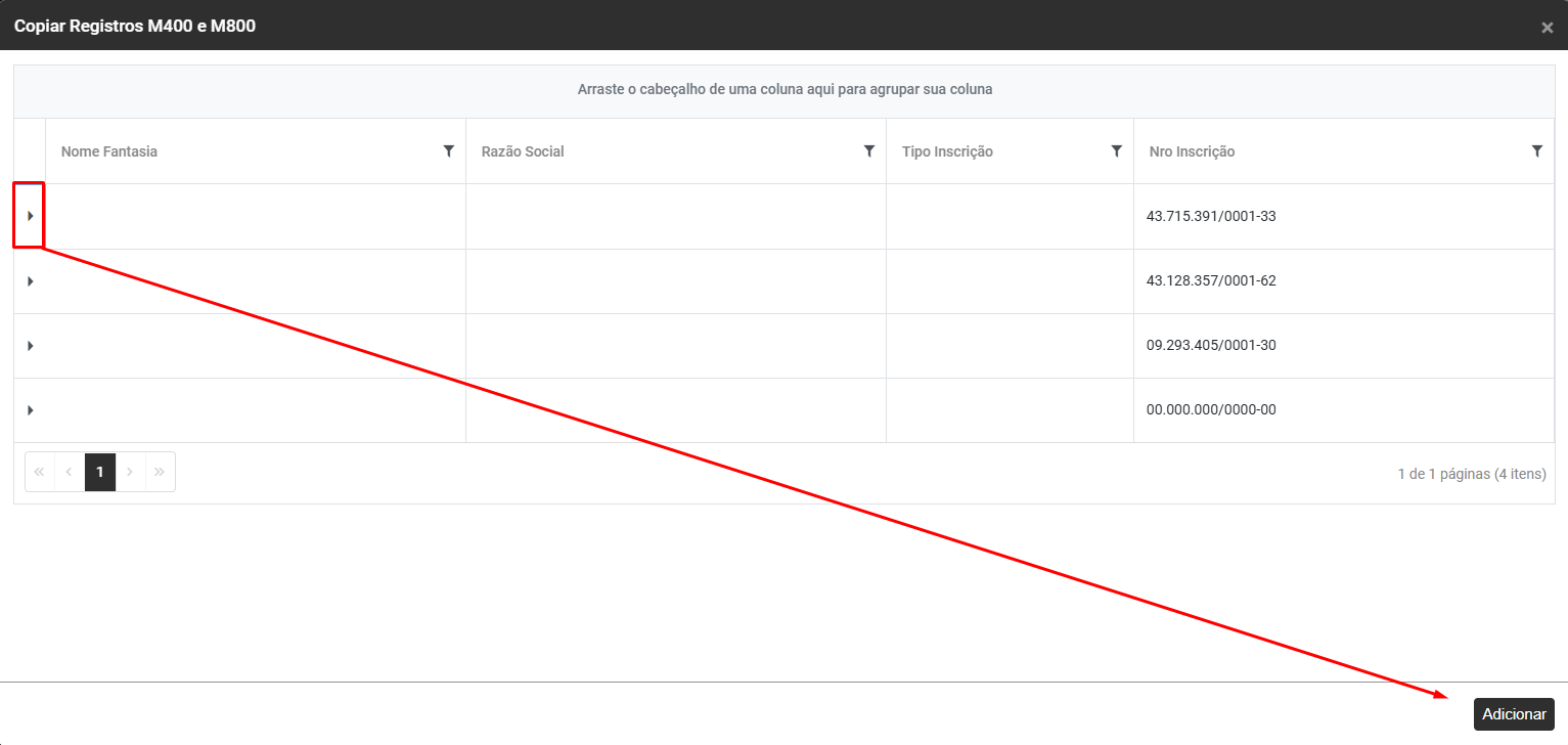 Ao ser acessado você deverá Expandir as Informações, Selecionar qual será a empresa de Origem, aquela que já possui as Contas Contábeis para M400 e M800 cadastradas e em seguida clicar em Adicionar