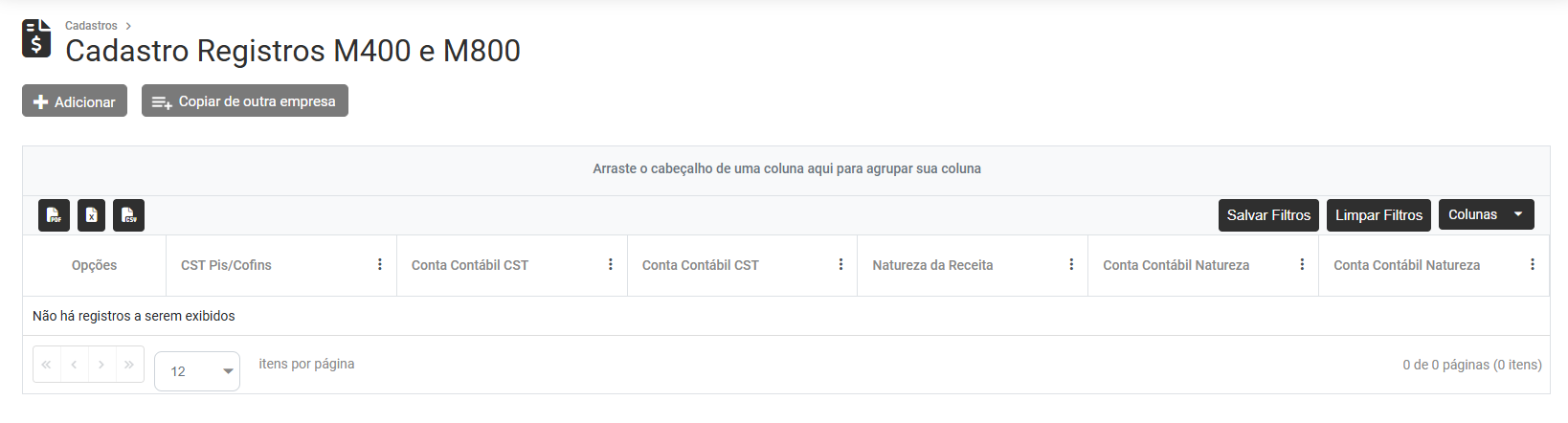 Na parte superior da tela você encontrará dois botões - Adicionar e Copiar de Outra Empresa