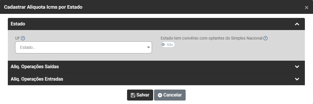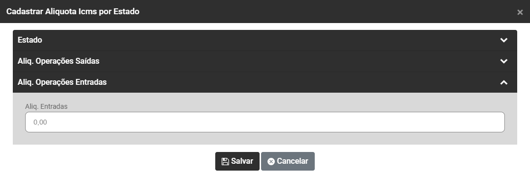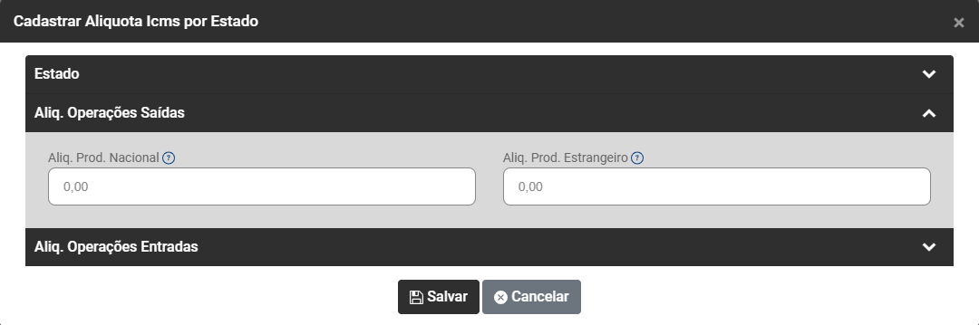 O Sistema apresentará a tela para que você faça o Cadastro da Alíquota ICMS por Estado, contendo: