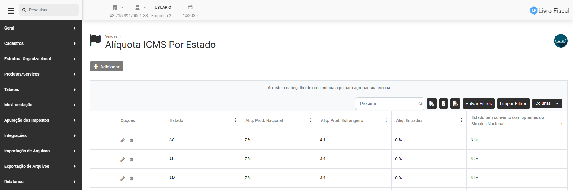 Ao ser acessado, será aberta a tela para Cadastro das Alíquotas Por Estado, com o grid de informações, que conterá: