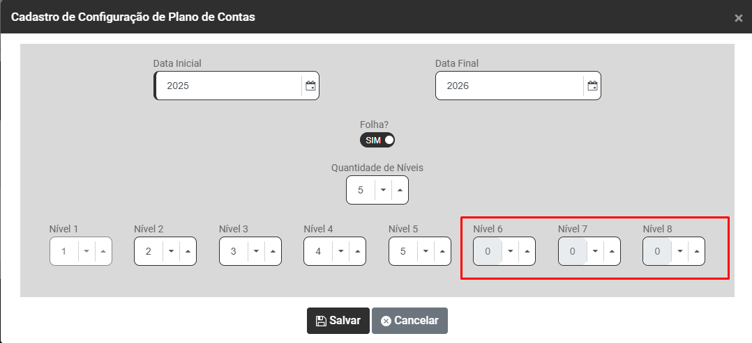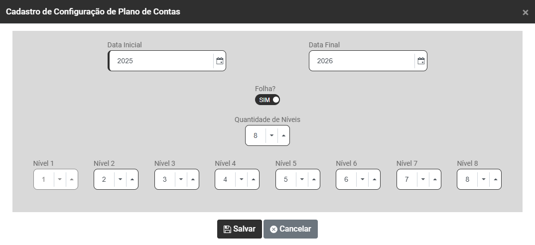 d) Informe quantos Níveis terá a Estrutura do Plano de Contas - Você conseguirá definir até 8 níveis para composição do Plano de Contas