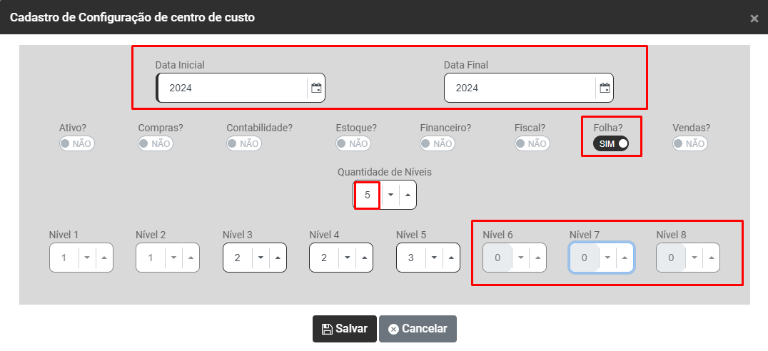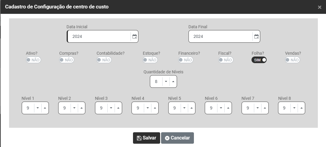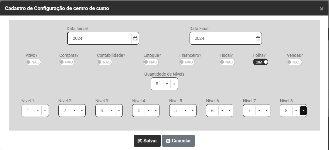 d) Informe quantos Níveis terá a Estrutura do Centro de Custo - Você conseguirá definir até 8 níveis para composição do Centro de Custo