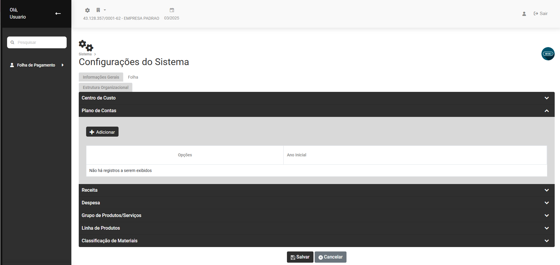 - PLANO DE CONTAS (utilização na integração com o Módulo de Contabilidade)