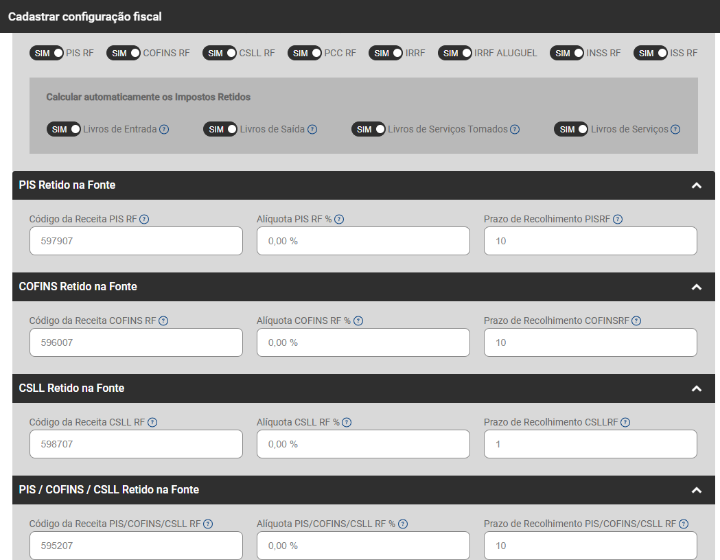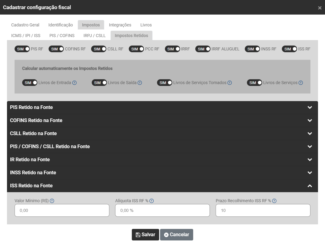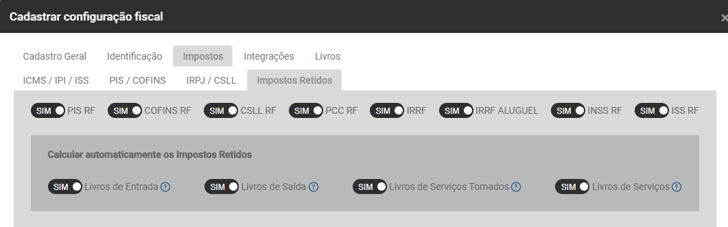 - Retém Imposto na Fonte - Se definir SIM os campos de PIS, COFINS, Contribuição Social e IRRF Retidos na Fonte serão habilitados no Livro de Saídas para devida escrituração.