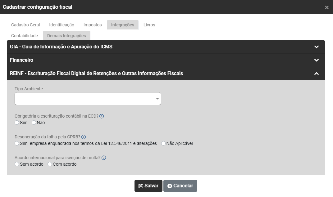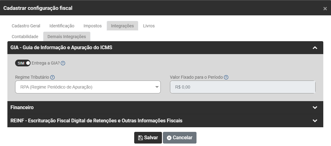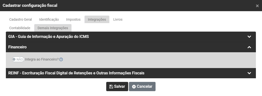 - Integra ao Financeiro - Ao definir SIM será habilitado as configurações a fim de realizar a integração com o Financeiro.