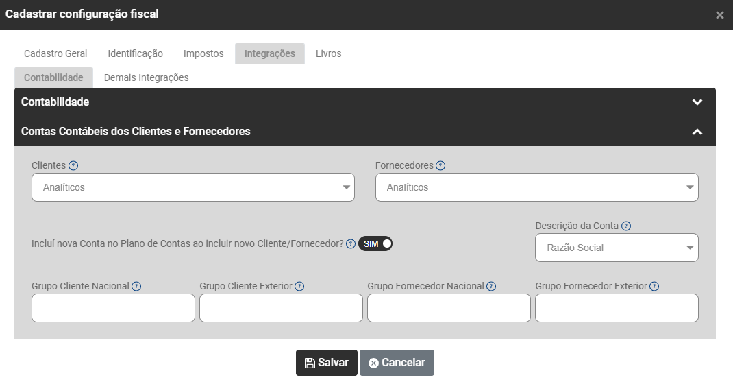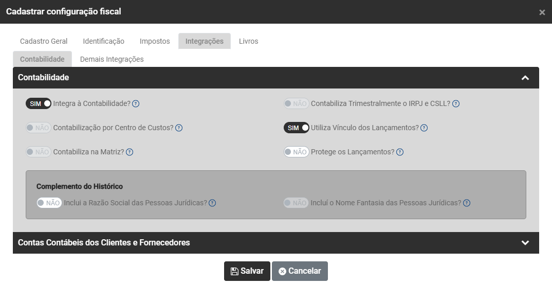 Defina se o Sistema Fiscal fará integração com o Sistema de Contabilidade - Ao definir SIM será habilitados os menus de configuração e definição das contas contábeis vinculadas aos clientes, fornecedores, livro caixa e impostos a fim de se realizar a integração com a contabilidade.
