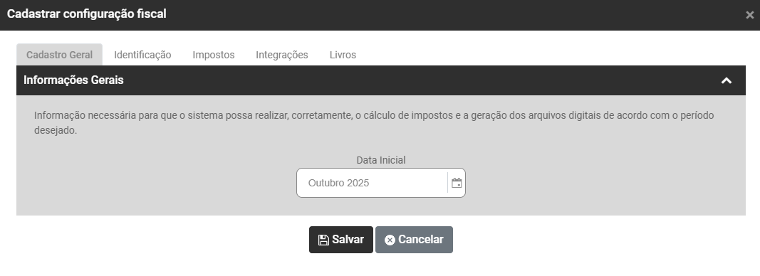 Aba Cadastro Geral - você deverá definir a data Inicial, Mês/Ano para que o Sistema possa realizar, corretamente as escriturações, cálculos de impostos e a geração dos arquivos digitais de acordo com o período