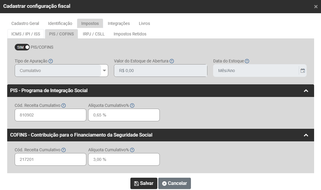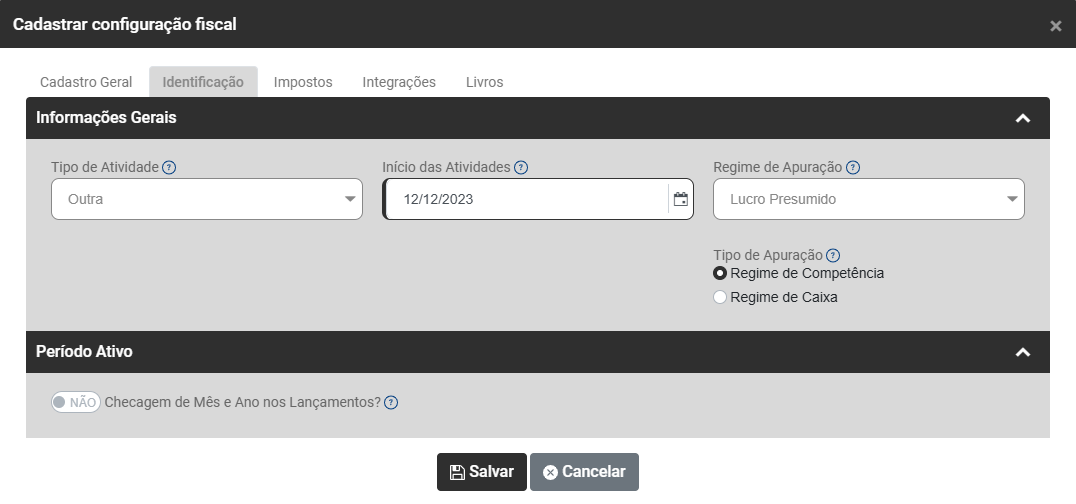 Cadastro das Configurações da Estrutura Organizacional e do Sistema Livros Fiscais