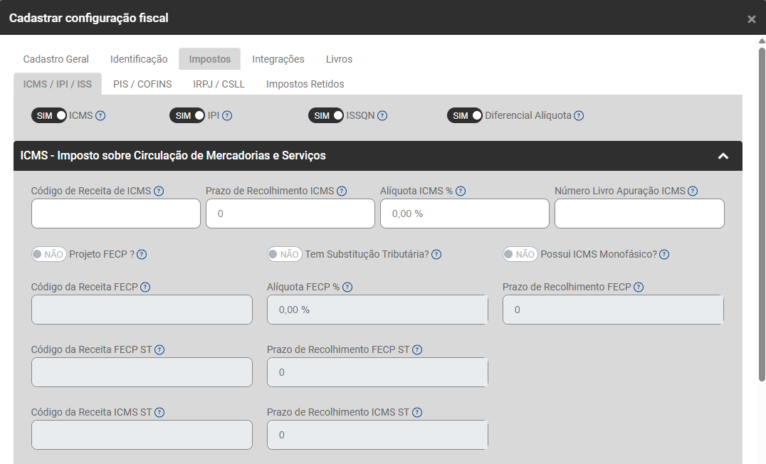 - ICMS - Ao definir SIM será exibidos os campos para configuração e geração da apuração do ICMS - Impostos sobre Circulação de Mercadorias e Serviços.