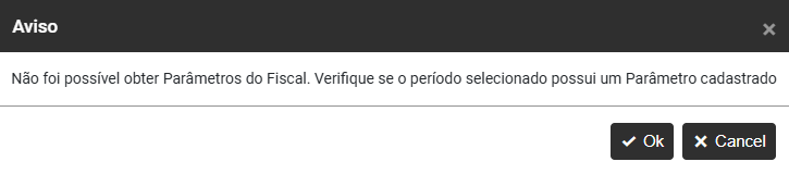 Quando você definir a Empresa e acessar o menu de configurações, se a mesma ainda não foi feita, o Sistema irá apresentar mensagem informando que não foi possível obter Parâmetros do Fiscal. Verifique se o período selecionado possui um Parâmetro cadastrado