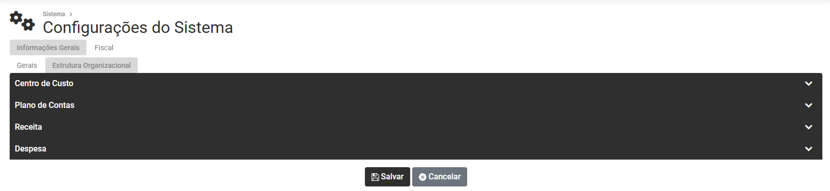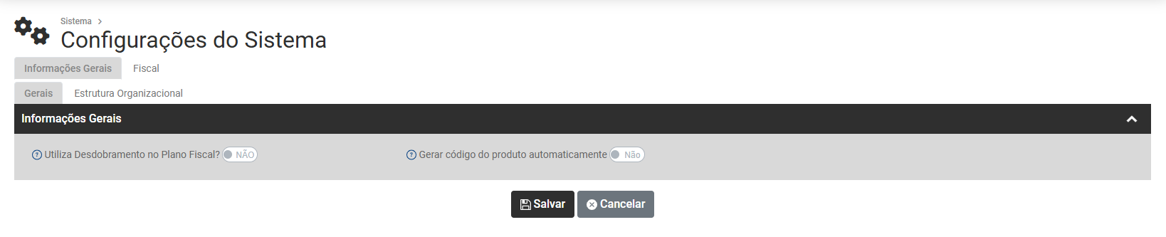 As Configurações do Sistema está dividida em duas abas (Gerais/Estrutura Organizacional e o Módulo Fiscal) e na aba Informações Gerais/Estrutura Organizacional você irá definir Configurações que serão utilizadas em todos os Módulos do Sistema