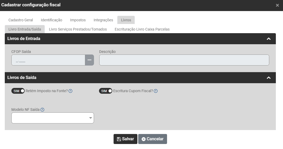 - Modelo NF Saída - Preencha nesse campo o Modelo das Notas Fiscais do Livro de Saídas.