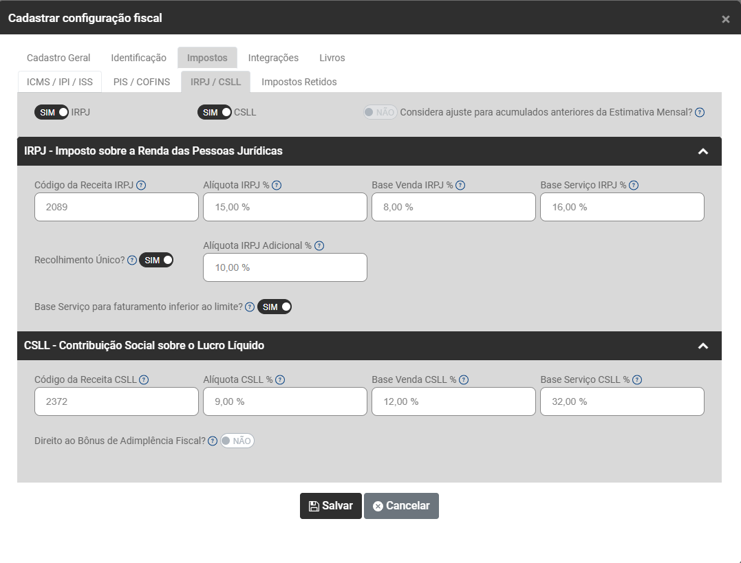 - Direito ao Bônus de Adimplência Fiscal - Preencha nesse campo a alíquota para calcular a base sobre o faturamento sobre os serviços prestados para IRPJ.