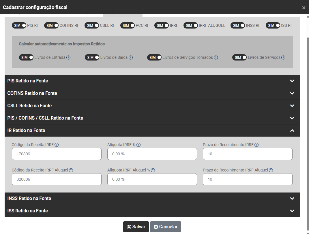 - Alíquota - Preencha nesse campo a Alíquota base do Imposto Retido na Fonte.