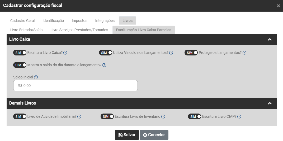 - Escritura Livro Caixa - Ao definir SIM será habilitado as configurações e o menu para escrituração do Livro Caixa