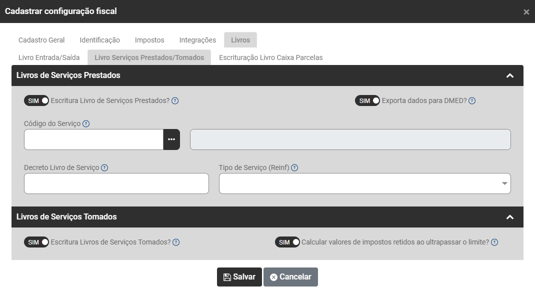 - Escritura Livros de Serviços Tomados - Se definir SIM será aberto o cadastro do Livro de Serviços Tomados para escrituração do Serviços.