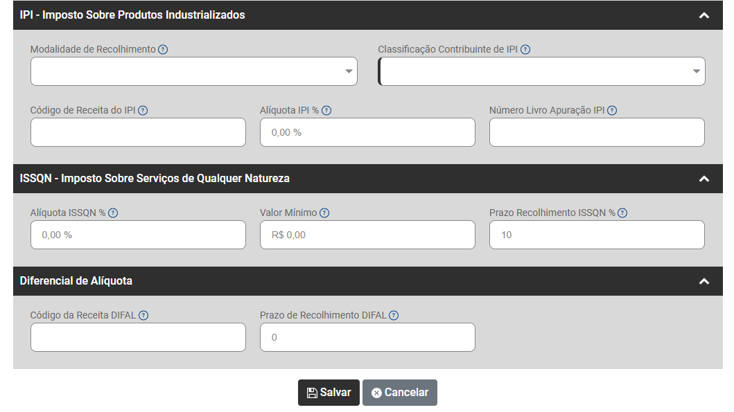 - IPI - Ao definir SIM será exibidos os campos para configuração e geração da apuração do IPI - Imposto sobre Produtos Industrializados.