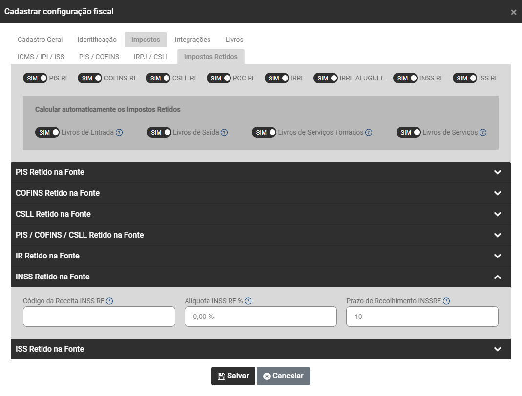 - Alíquota INSS RF% - Preencha nesse campo a Alíquota base do INSS Retido na Fonte.