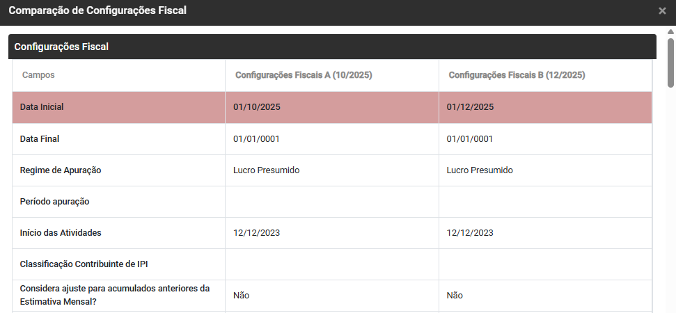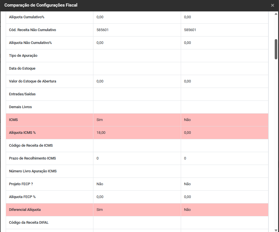 Será apresentada a tela de Comparação de Configurações Fiscais com as colunas: