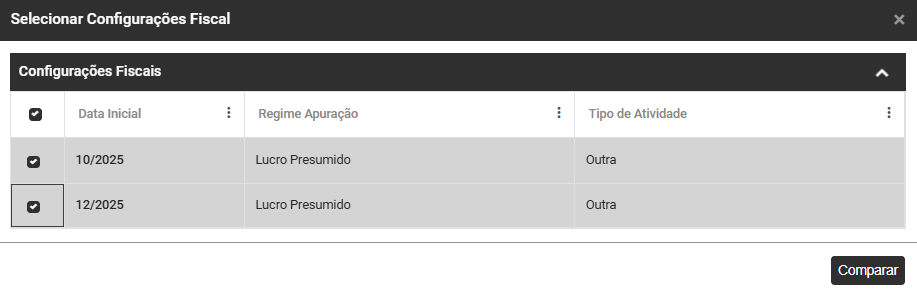 Ao acionar o botão o Sistema irá apresentar a tela para Selecionar as Configurações Fiscais que serão comparadas, faça a seleção e clique em Comparar