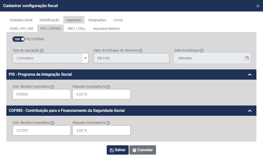 - Alíquota do COFINS Cumulativo - Preencha nesse campo a Alíquota base do COFINS