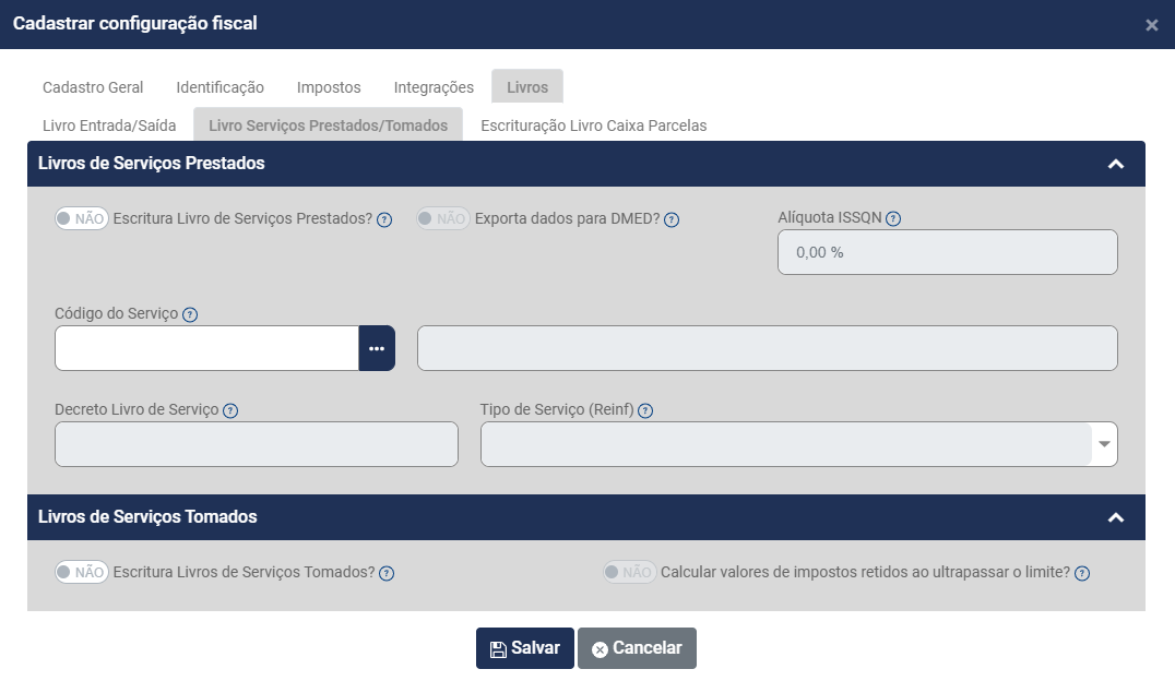 - Escritura Livros de Serviços Tomados - Se definir SIM será aberto o cadastro do Livro de Serviços Tomados para escrituração do Serviços.