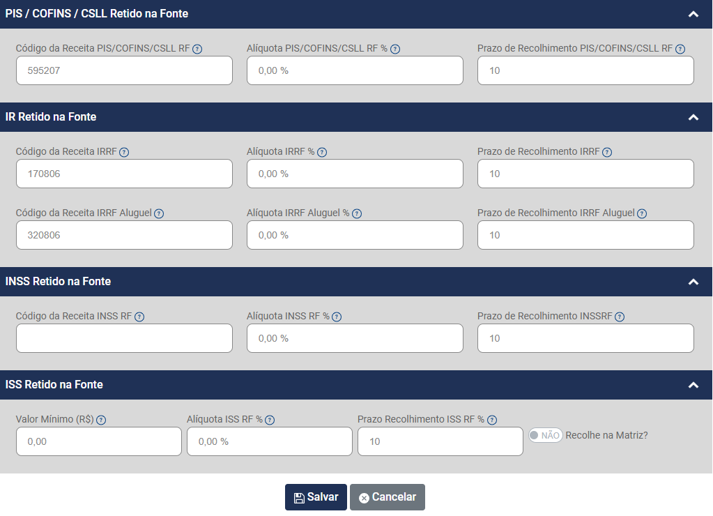 - Calcular valores de Impostos Retidos ao ultrapassar o limite - Ao definir SIM será calculado valores de Impostos Retidos automaticamente ao ultrapassar o limite de R$4.999,99 para o mesmo emitente.