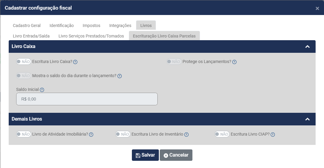 - Escritura Livro Caixa - Ao definir SIM será habilitado as configurações e o menu para escrituração do Livro Caixa