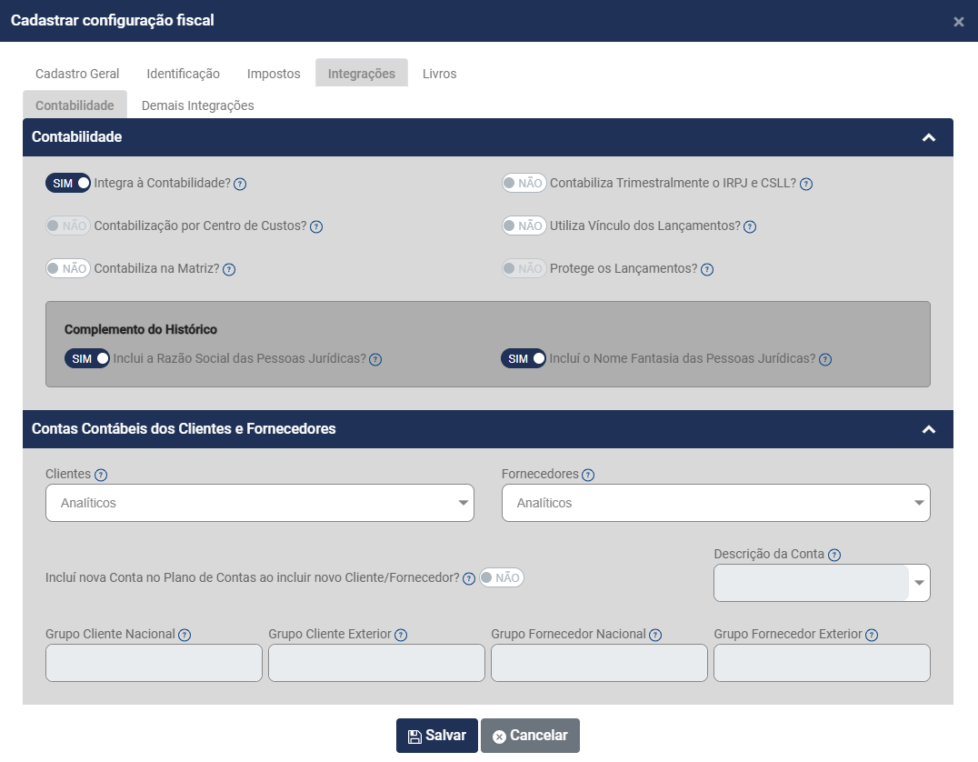 Defina se o Sistema Fiscal fará integração com o Sistema de Contabilidade - Ao definir SIM será habilitados os menus de configuração e definição das contas contábeis vinculadas aos clientes, fornecedores, livro caixa e impostos a fim de se realizar a integração com a contabilidade.
