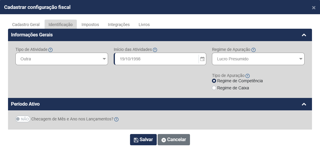 Cadastro Geral - você deverá definir a data Inicial, Mês/Ano para que o Sistema possa realizar, corretamente, o cálculo de impostos e a geração dos arquivos digitais de acordo com o período