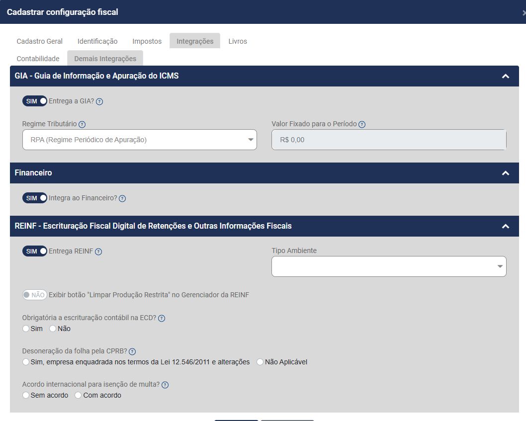 - Financeiro - Ao definir SIM será habilitado as configurações a fim de realizar a integração com o Financeiro.