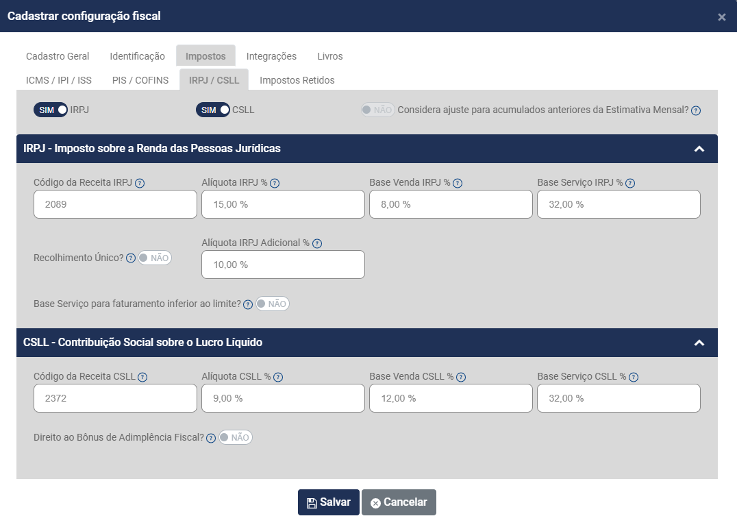 Caso seja definido SIm para IRPJ e CSLL será aberto os campos para que você faça a definição de informações referente a esses Impostos
