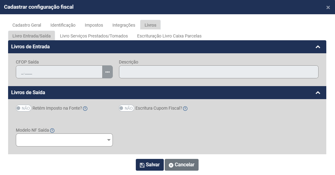 - Modelo NF Saída - Preencha nesse campo o Modelo das Notas Fiscais do Livro de Saídas.