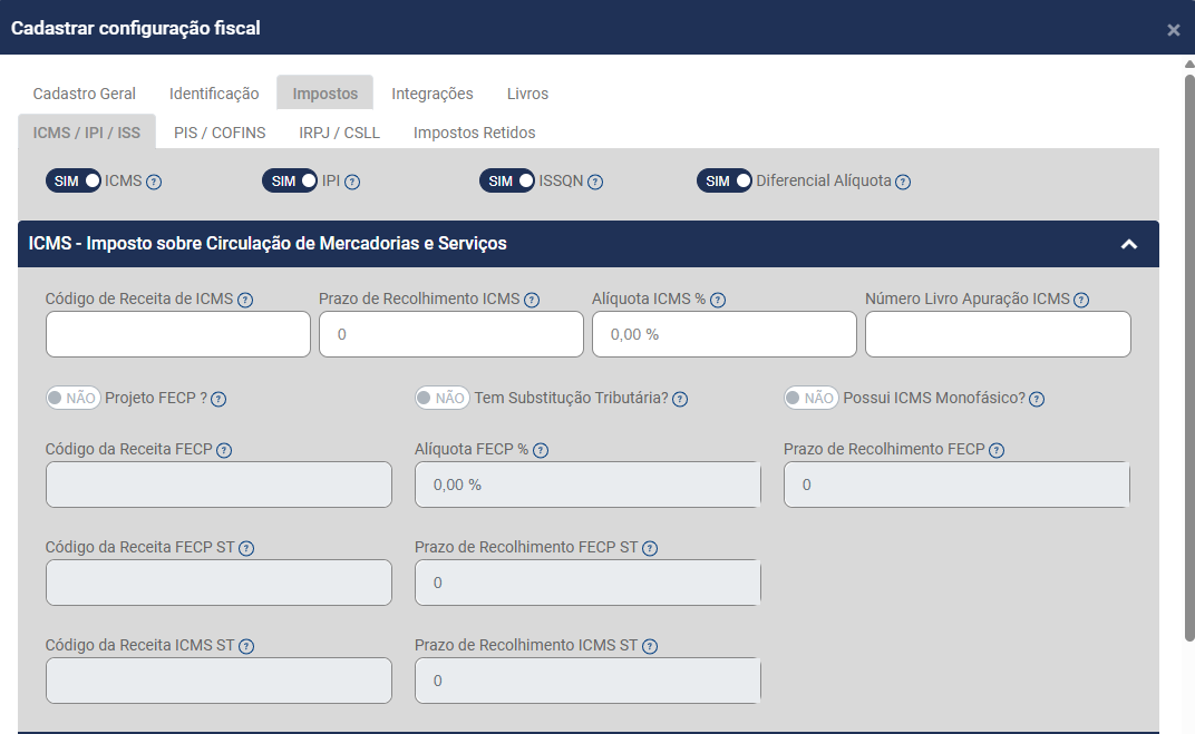 - ICMS - Ao definir SIM será exibidos os campos para configuração e geração da apuração do ICMS - Impostos sobre Circulação de Mercadorias e Serviços.