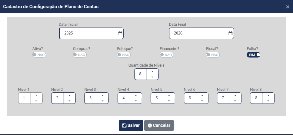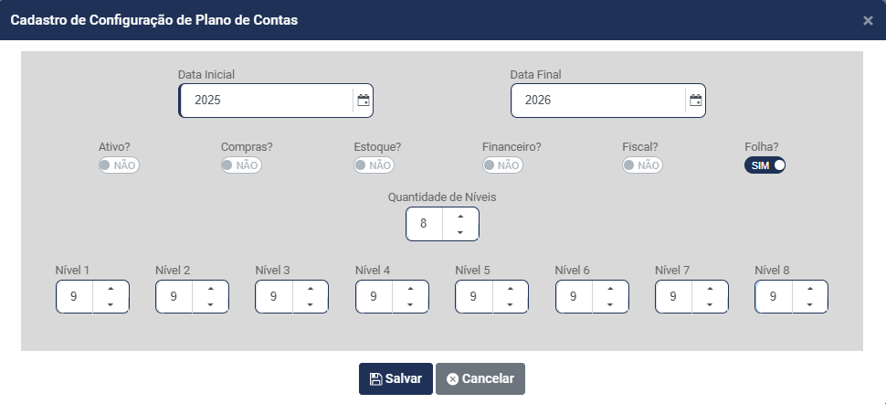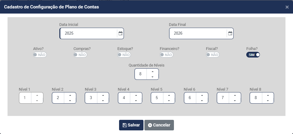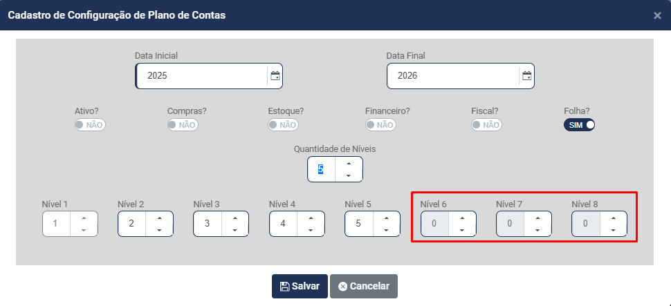 d) Informe quantos Níveis terá a Estrutura do Plano de Contas - Você conseguirá definir até 8 níveis para composição do Plano de Contas