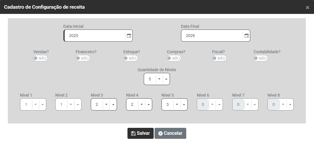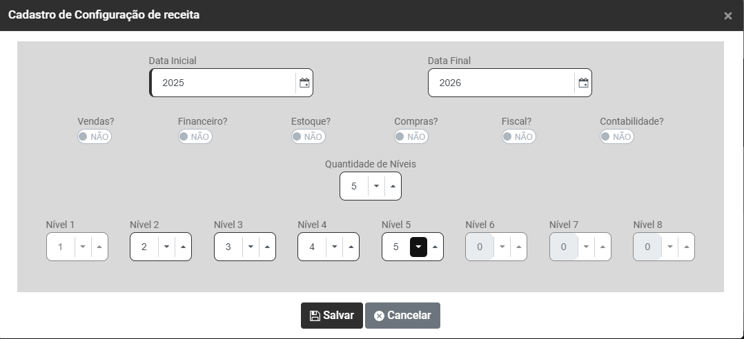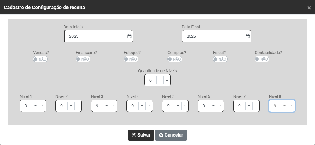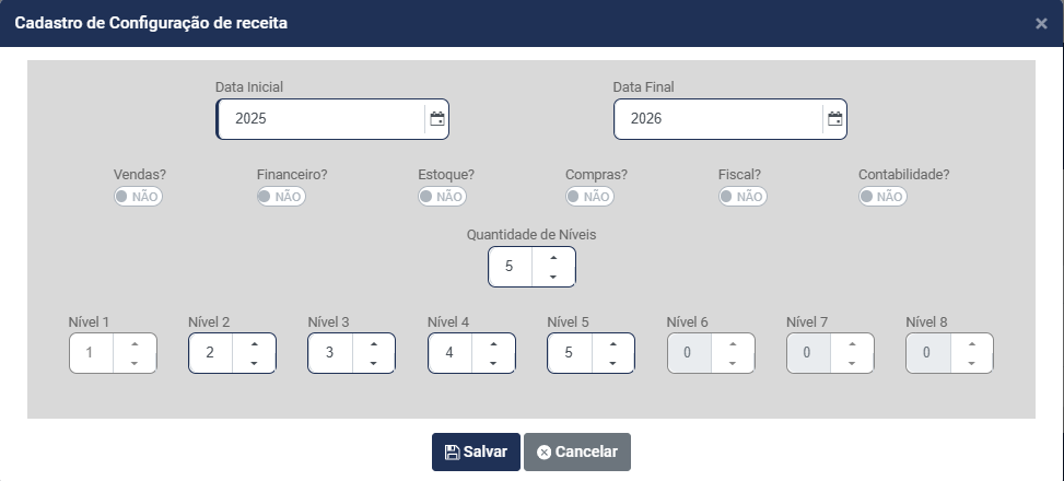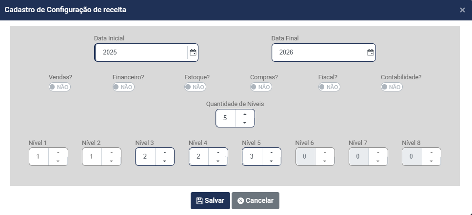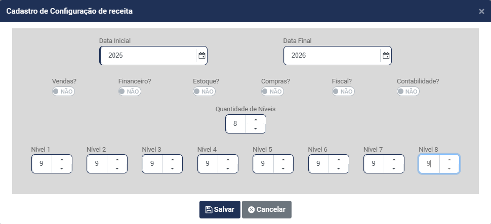d) Informe quantos Níveis terá a Estrutura da Receita - Você conseguirá definir até 8 níveis para composição da Receita